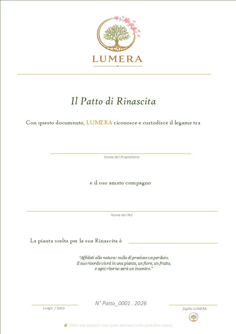 Un documento elegante che custodisce il nome del tuo animale e la pianta scelta, rendendo concreta una decisione presa con il cuore.